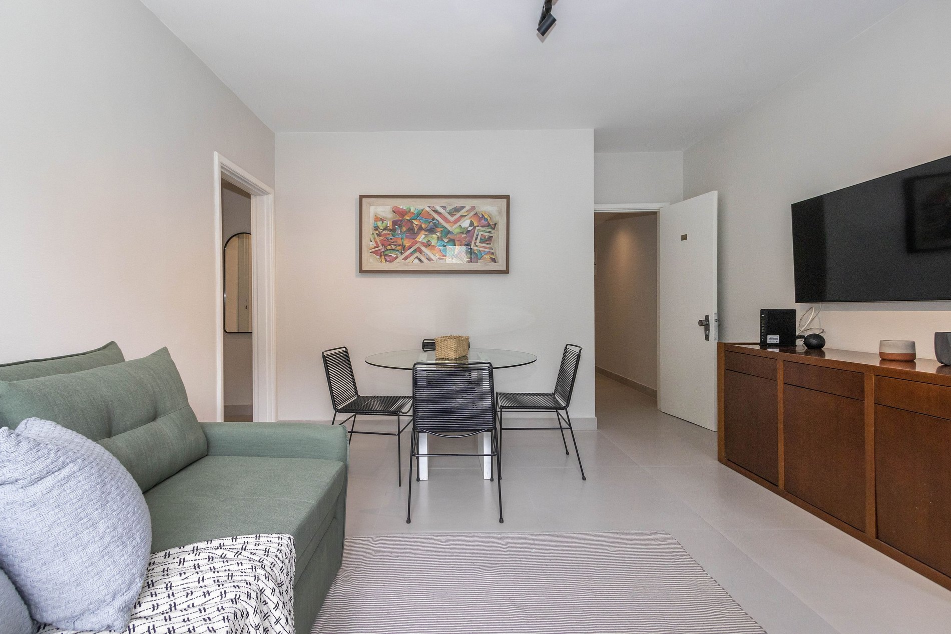 Para quem está viajando com a família ou entre amigos, este flat é o lugar certo. Com 2 amplos quartos, sendo 1 suíte com cama king, um quarto com duas camas de solteiro e um sofá cama na sala, o imóvel tem capacidade para receber até 6 pessoas. Da varanda é possível ver a praia de Copacabana, que fica bem próximo, no final da rua.