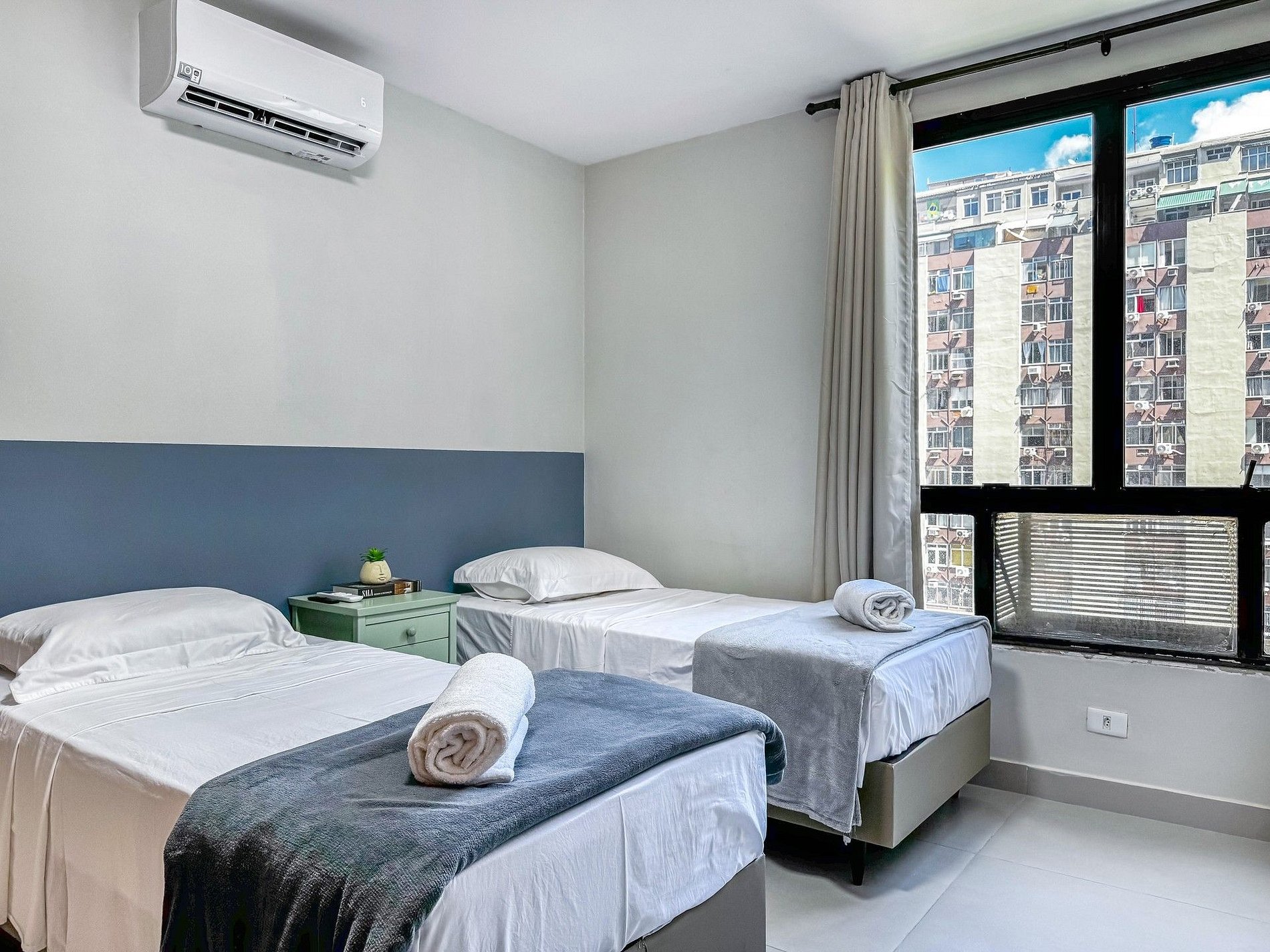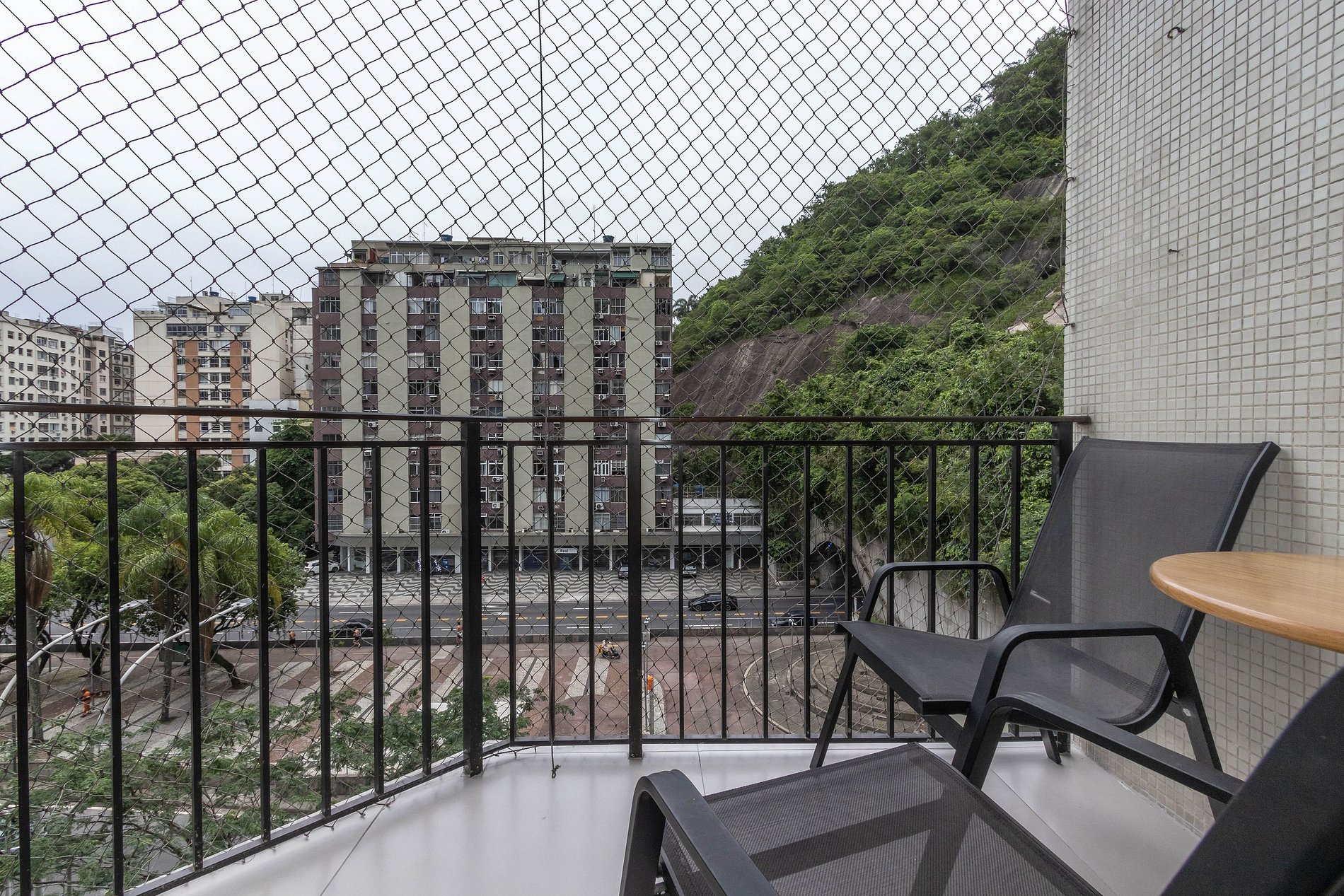 Para quem está viajando com a família ou entre amigos, este flat é o lugar certo. Com 2 amplos quartos, sendo 1 suíte com cama king, um quarto com duas camas de solteiro e um sofá cama na sala, o imóvel tem capacidade para receber até 6 pessoas. Da varanda é possível ver a praia de Copacabana, que fica bem próximo, no final da rua.
