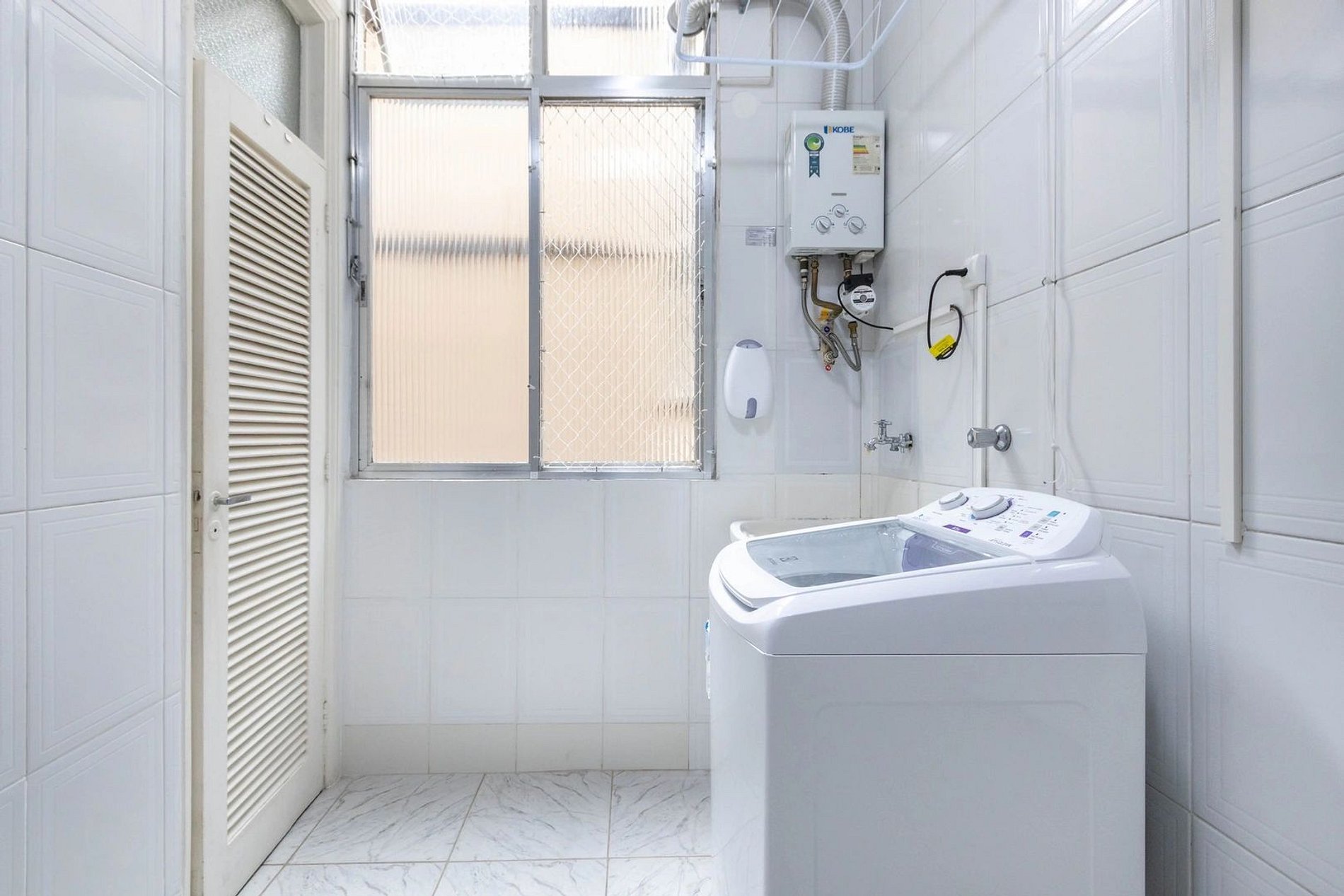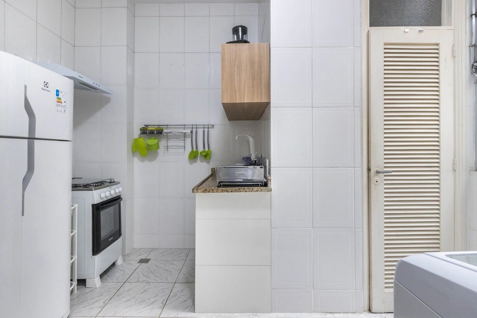 A sala como os quartos possuem ar-condicionado, a cozinha e totalmente equipada, integrada com a área de serviço que conta com máquina de lavar roupas e ferro de passar.