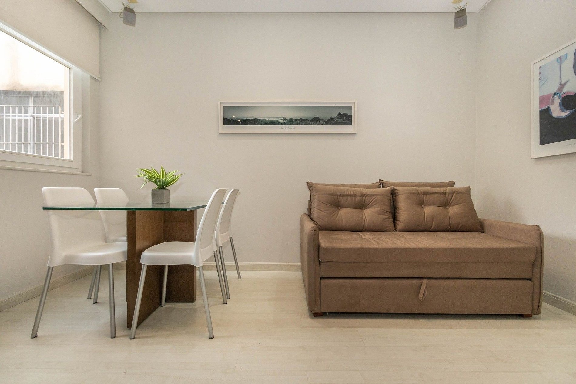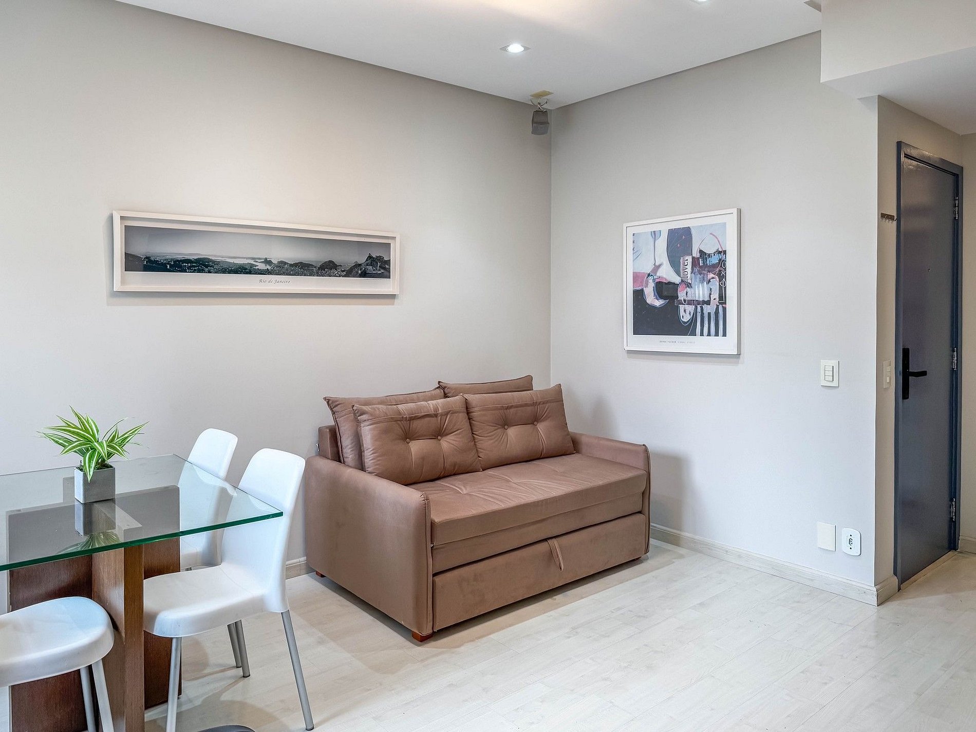 Ao entrar no apartamento, temos uma sala com sofá cama, Smart tv de 50", uma poltrona, uma mesa de jantar, e uma banheiro social.