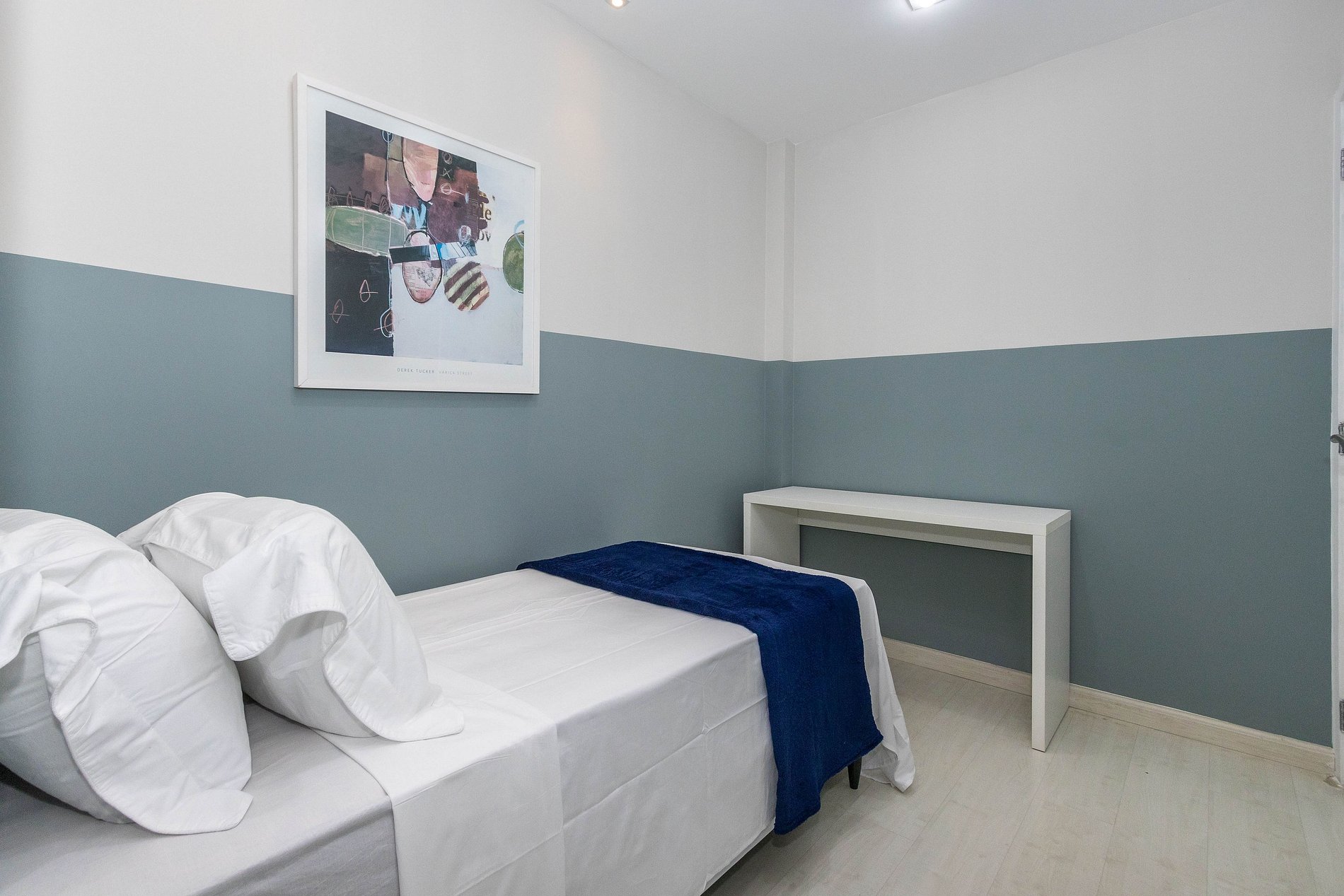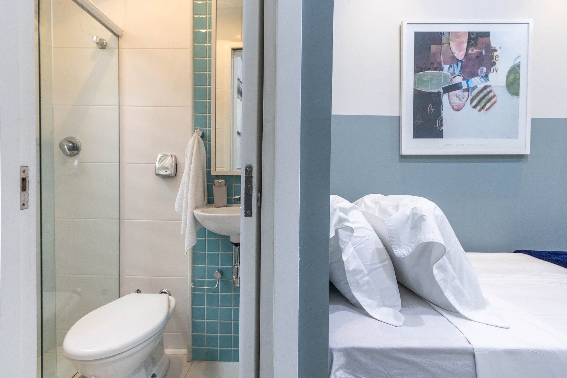 Na área intima, temos 2 suítes, sendo 1 delas master com cama queen, smart tv, hidromassagem dupla e banheiro. A outra suíte conta com uma cama de solteiro e espaço para trabalho. Todo o enxoval é da Buddmeyer, padrão hotel boutique e os amenities (shampoo, condicionador e sabonete) são da linha Natura Spa da Boticário ou da L'Occitane au Brésil.