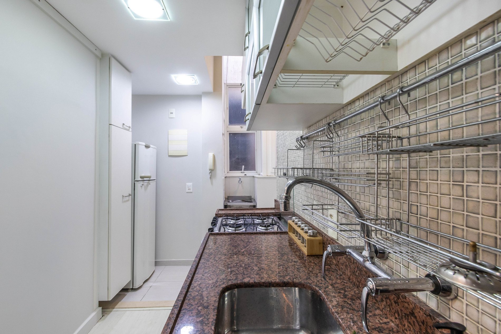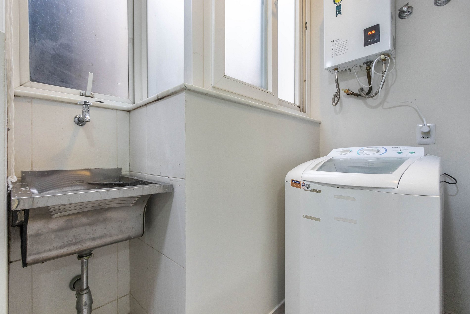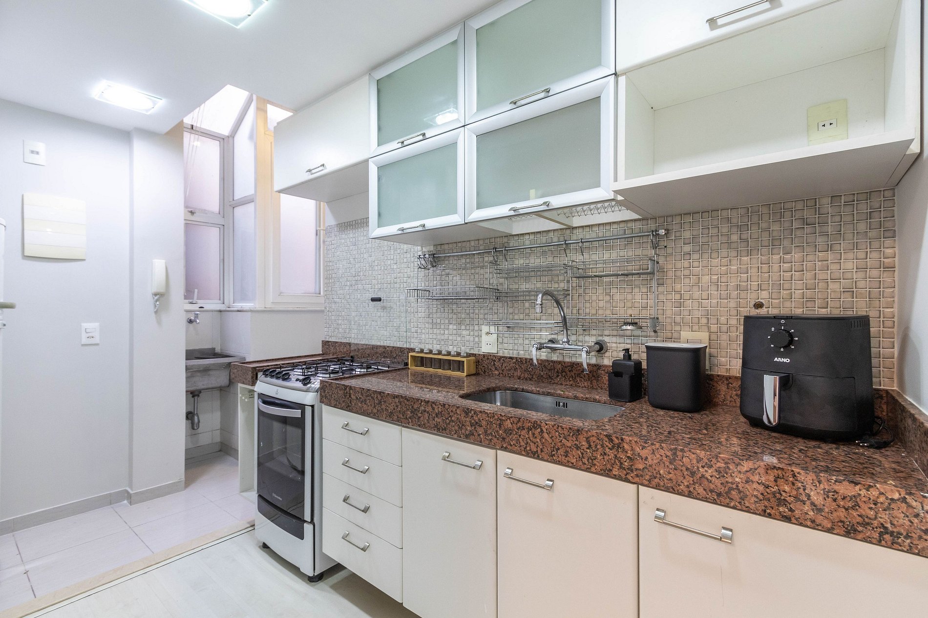 O imóvel também possuí uma cozinha completa com todos eletrodomésticos e utensílios necessários para cozinhar. Além de uma área de serviço com máquina de lavar roupas.