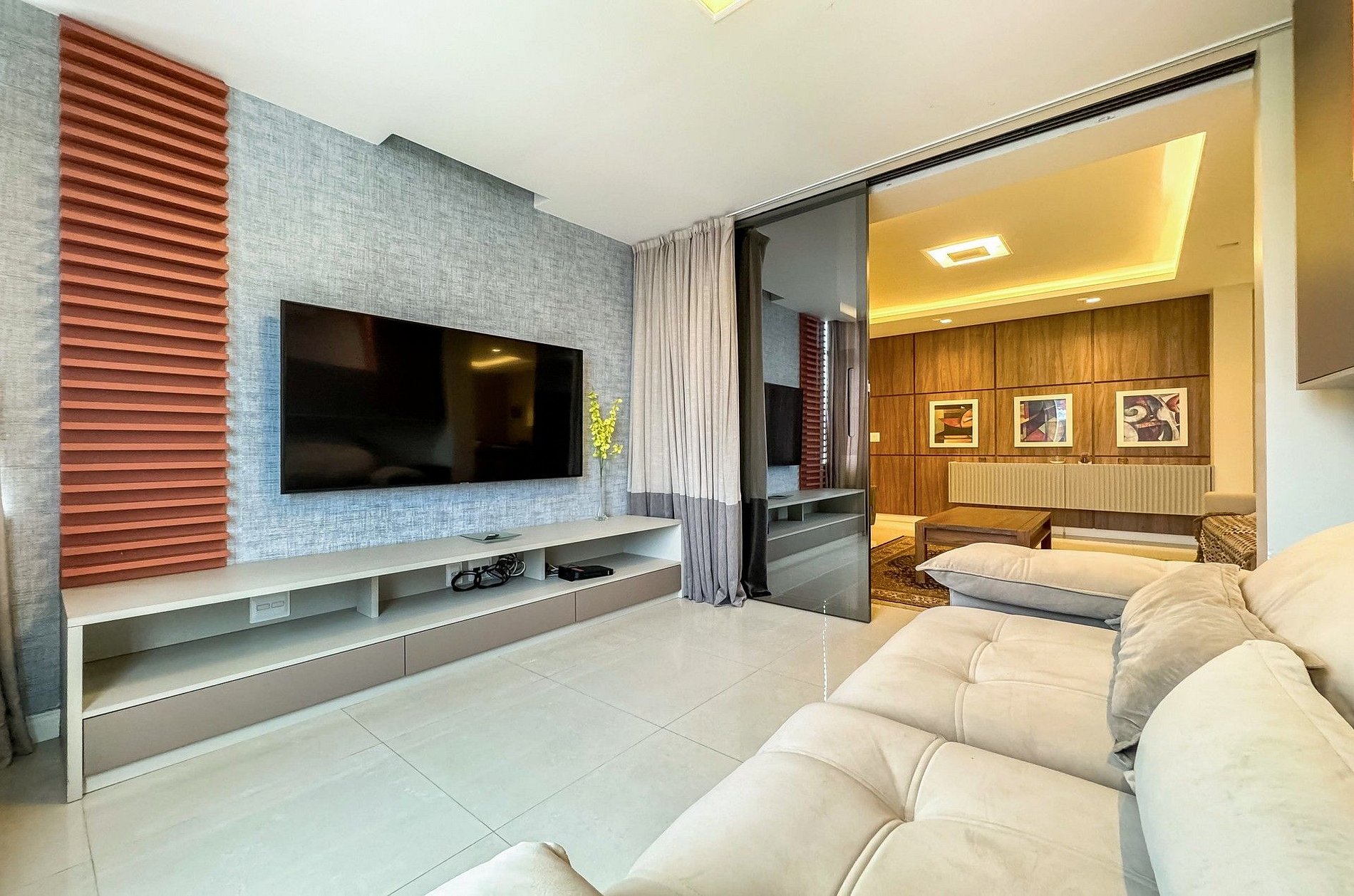 Ao entrar no apartamento você vai se deparar com um amplo living dividido em 4 ambientes, sala de estar, sala de jantar, sala de vídeo e um charmoso espaço com rede para relaxar, além de um banheiro social.