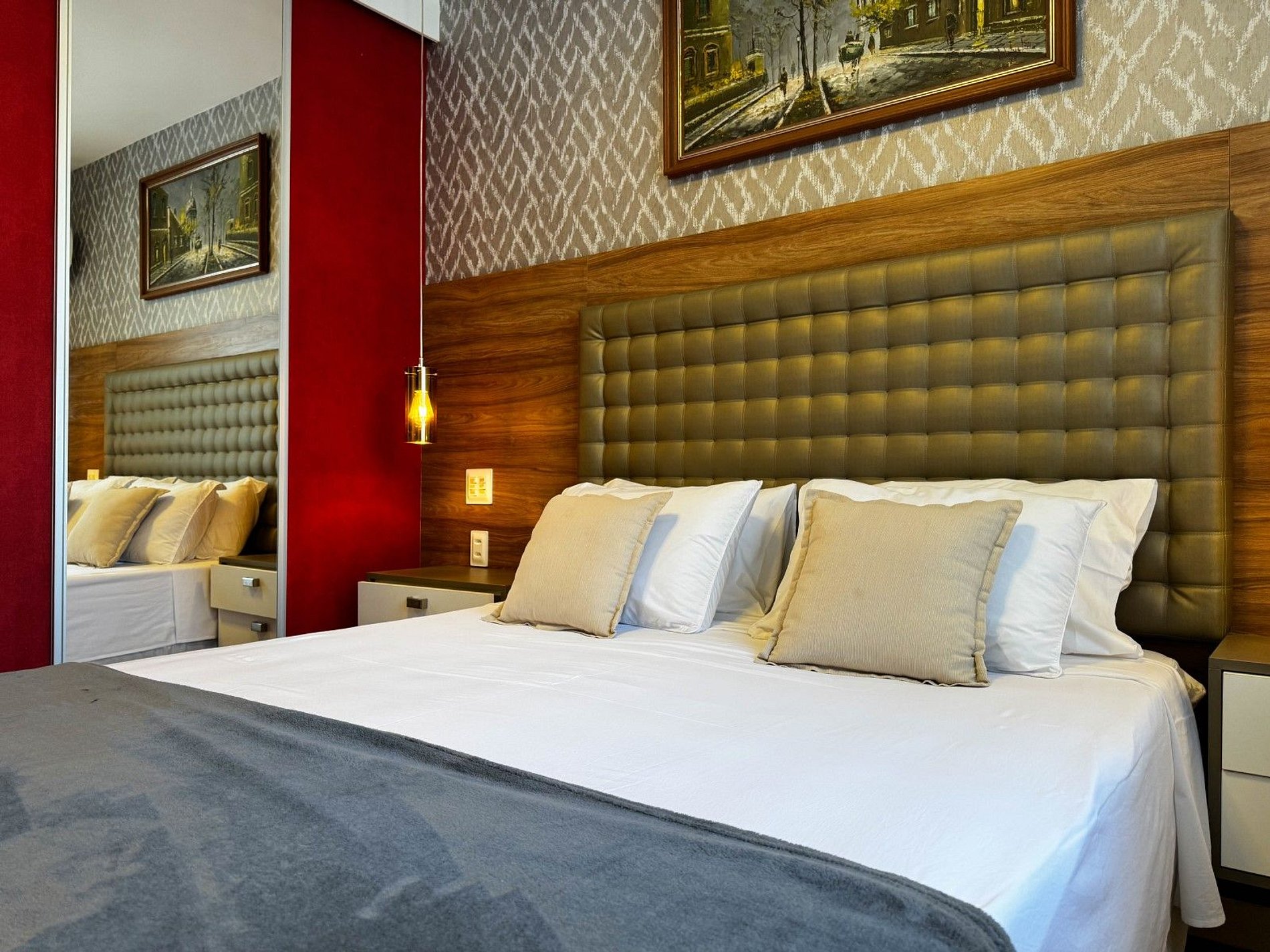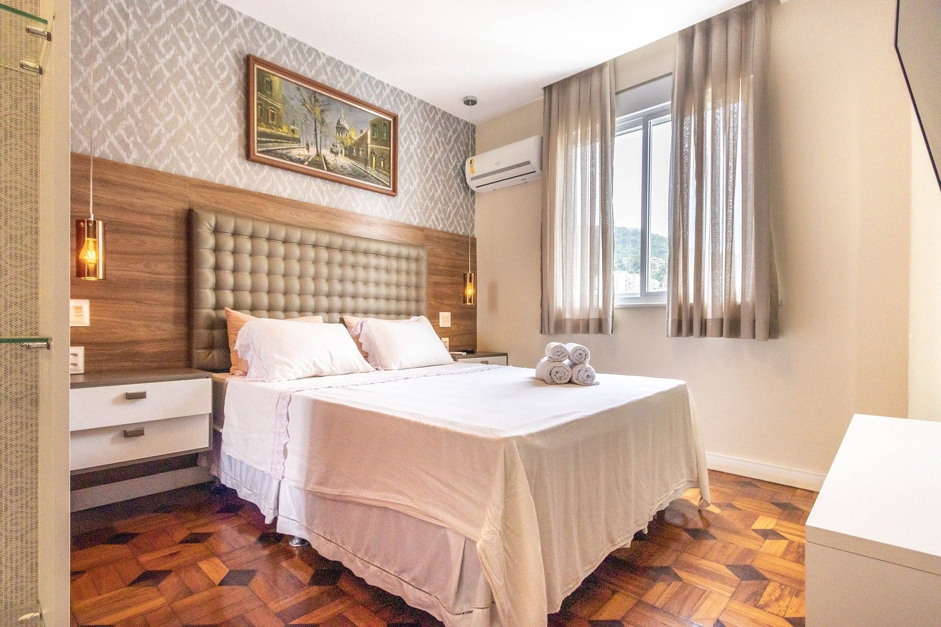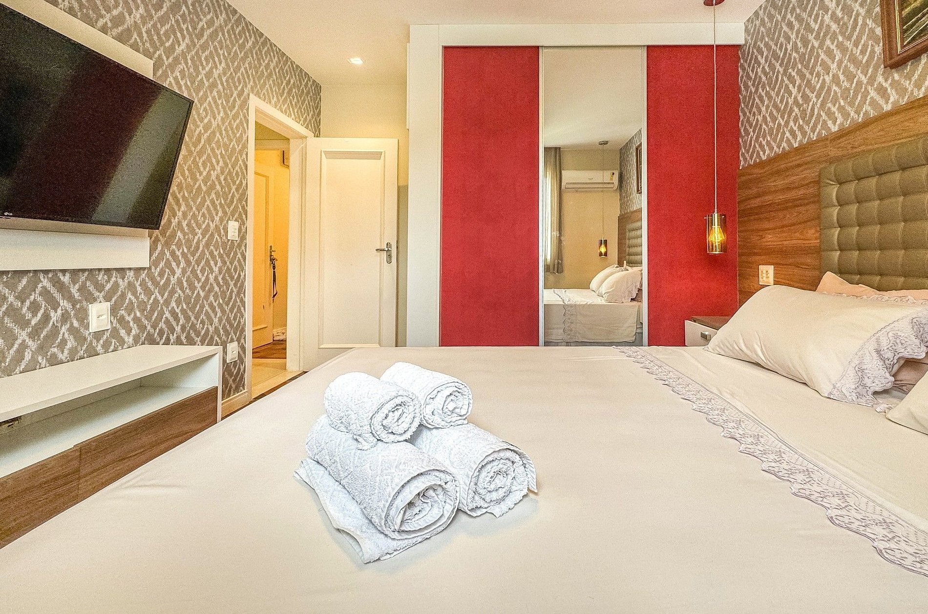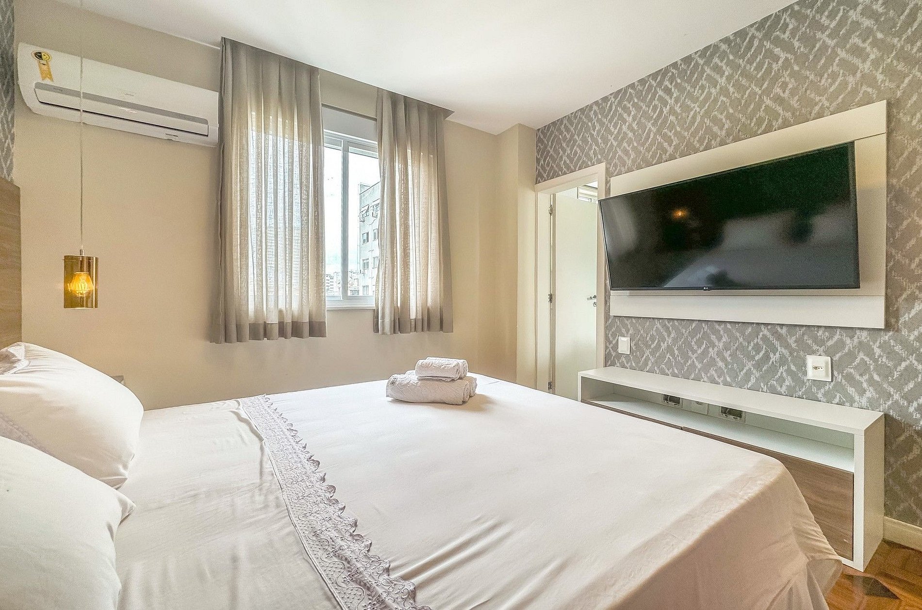 Na área intima, o imóvel conta com uma suíte master com cama queen, smart TV, ar-condicionado, amplo banheiro e closet, que dá acesso ao work station. O imóvel ainda possuí uma segunda suíte menor com cama de casal, smart Tv e ar-condicionado.