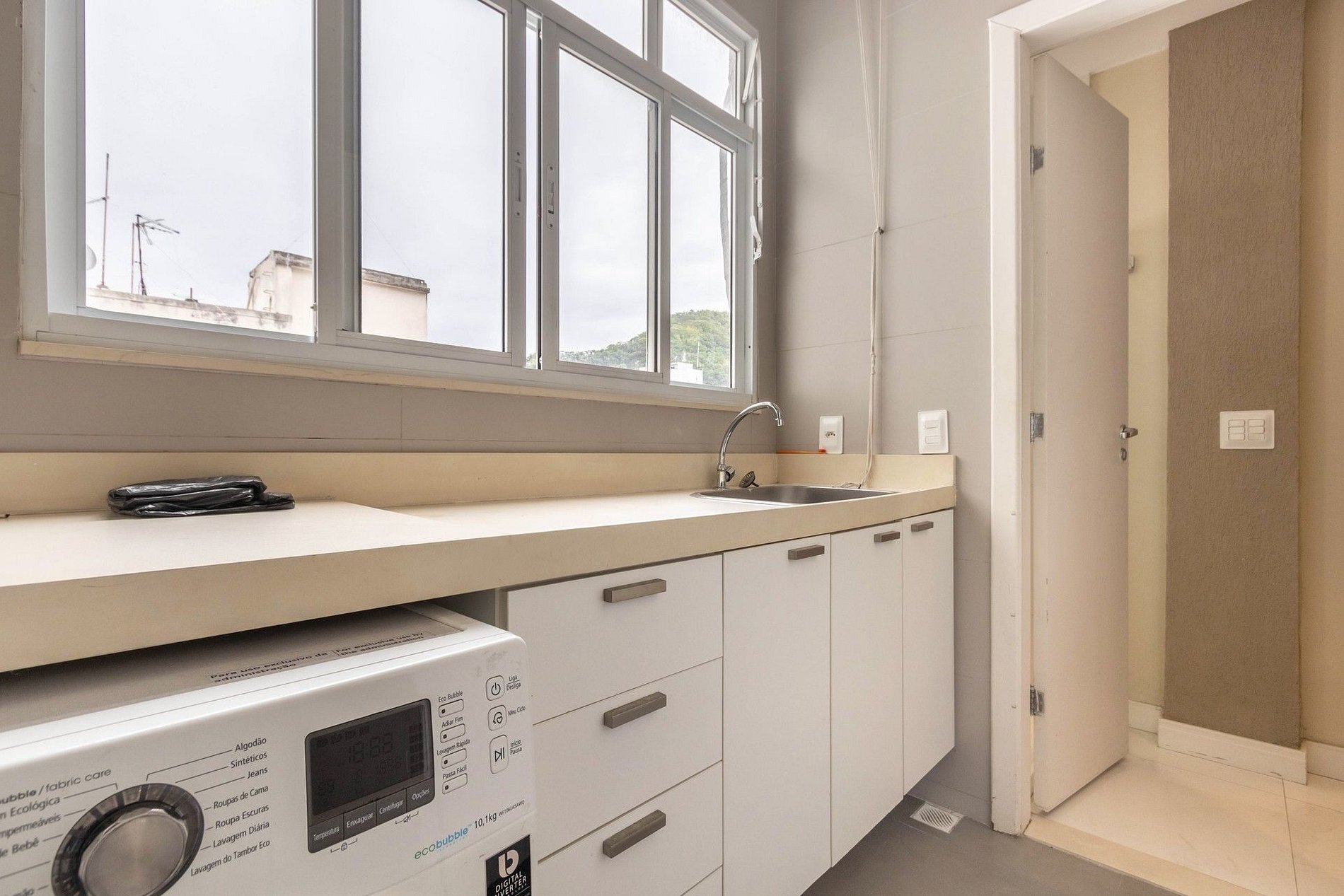 A cozinha é totalmente completa e equipada, passando a cozinha, chegamos a área de serviço, que possuí uma lava e seca.