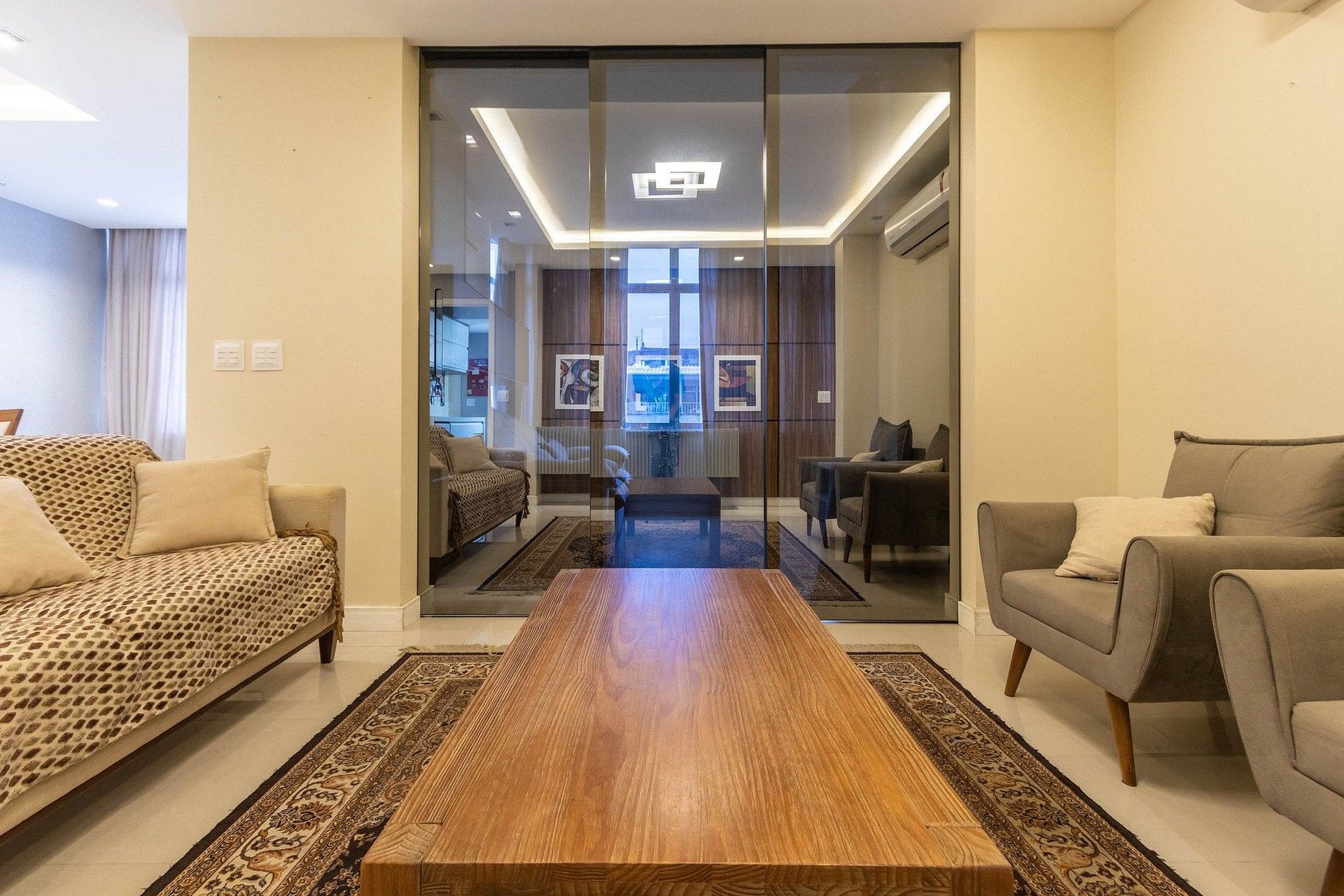 Ao entrar no apartamento você vai se deparar com um amplo living dividido em 4 ambientes, sala de estar, sala de jantar, sala de vídeo e um charmoso espaço com rede para relaxar, além de um banheiro social.