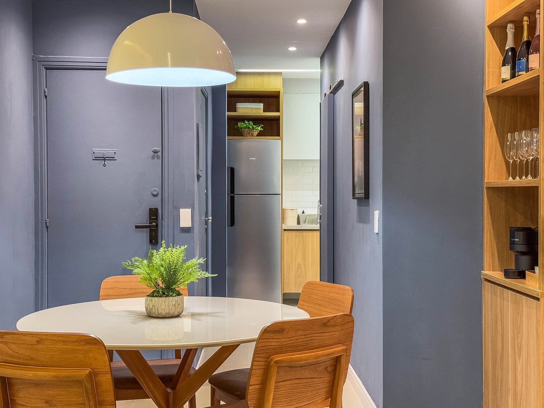 Ao entrar na sala, o hóspede encontra uma bela mesa de jantar, ao lado do espaço do café, onde sempre deixamos algumas cápsulas da Nespresso como cortesia. Um pouco mais a frente, temos a sala de estar com um sofá-cama confortável para 2 pessoas, além de uma Smart TV 50" e ar-condicionado. A sala ainda conta com um banheiro social completo.