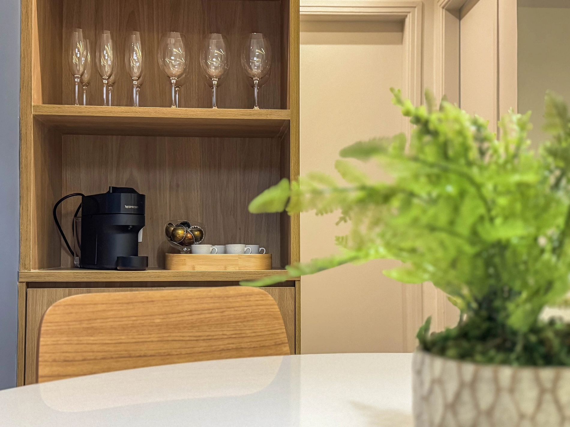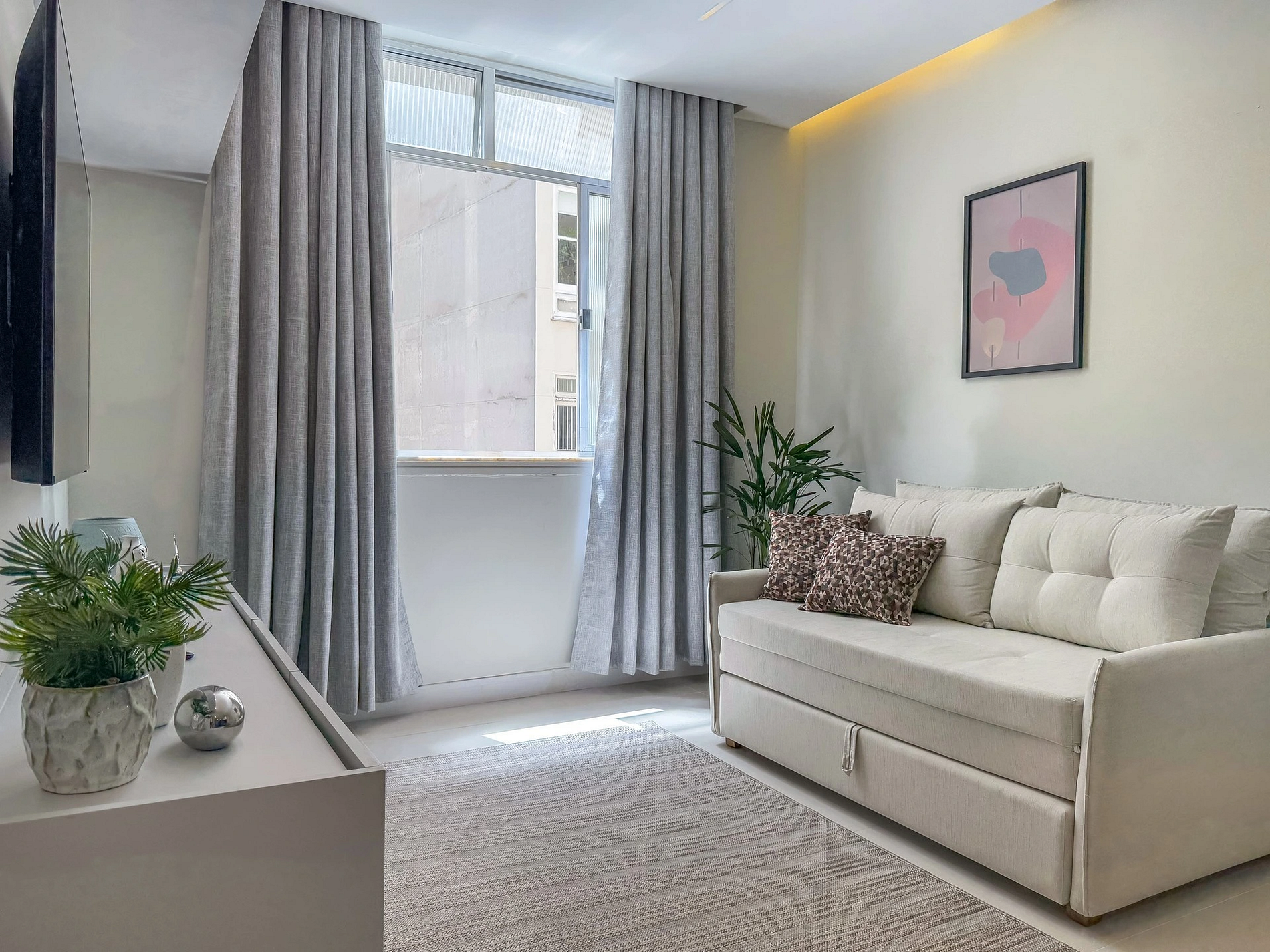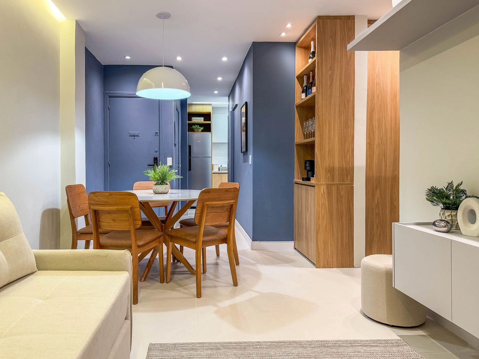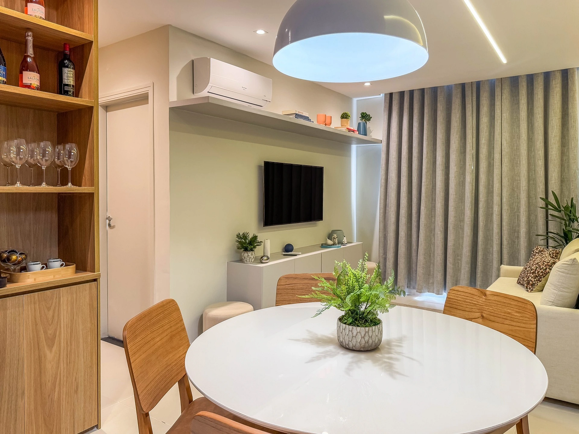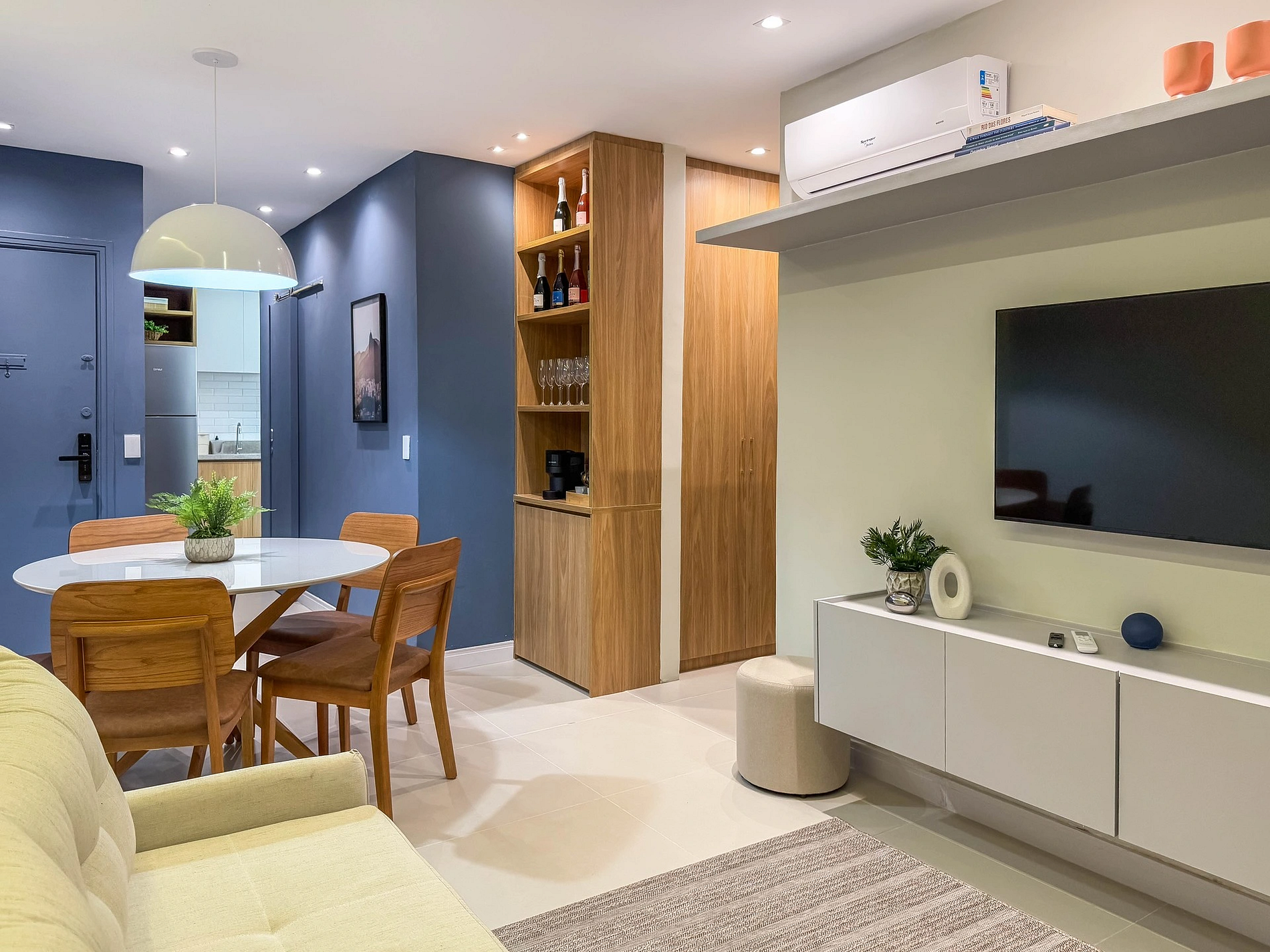 Ao entrar na sala, o hóspede encontra uma bela mesa de jantar, ao lado do espaço do café, onde sempre deixamos algumas cápsulas da Nespresso como cortesia. Um pouco mais a frente, temos a sala de estar com um sofá-cama confortável para 2 pessoas, além de uma Smart TV 50" e ar-condicionado. A sala ainda conta com um banheiro social completo.