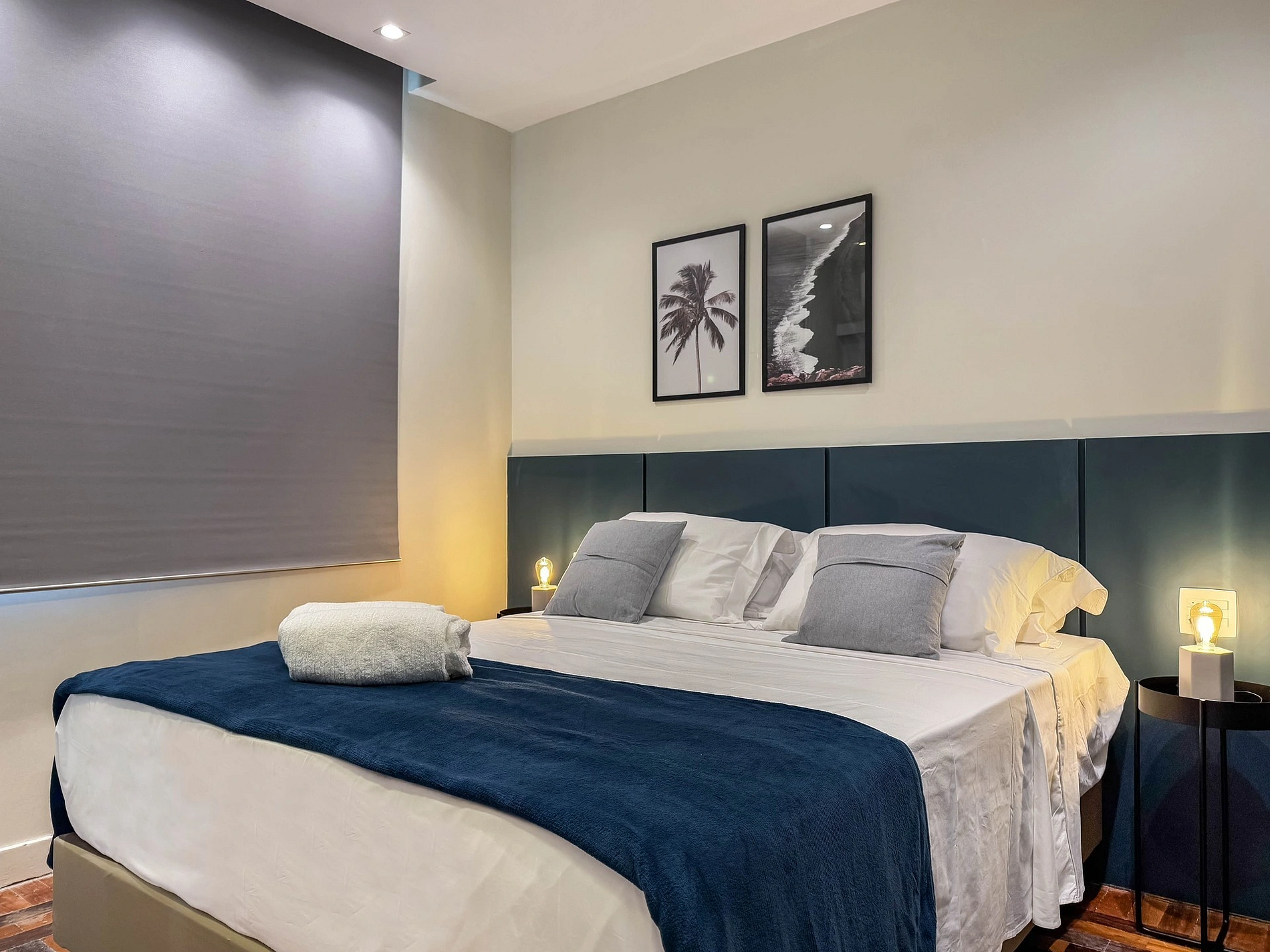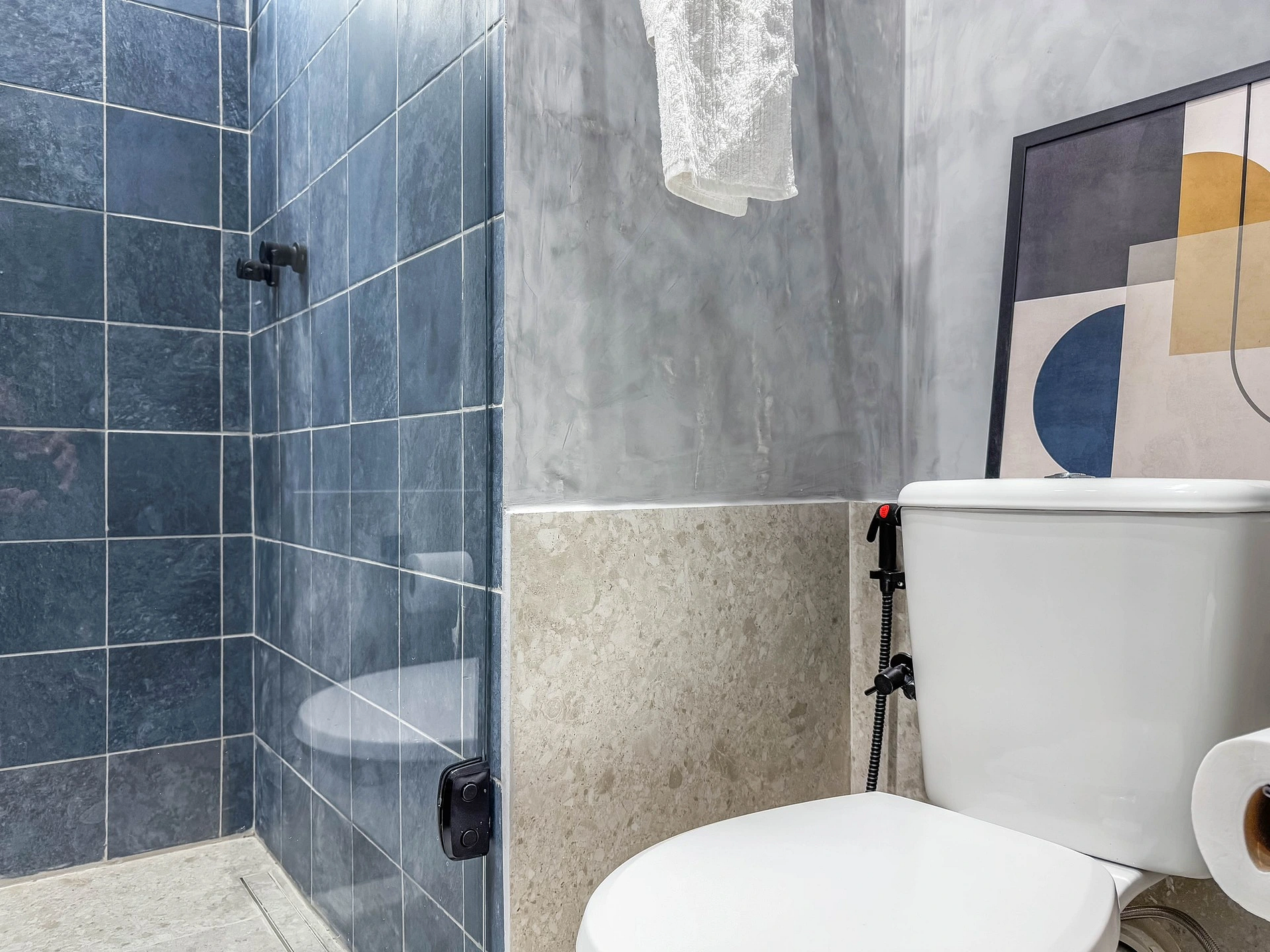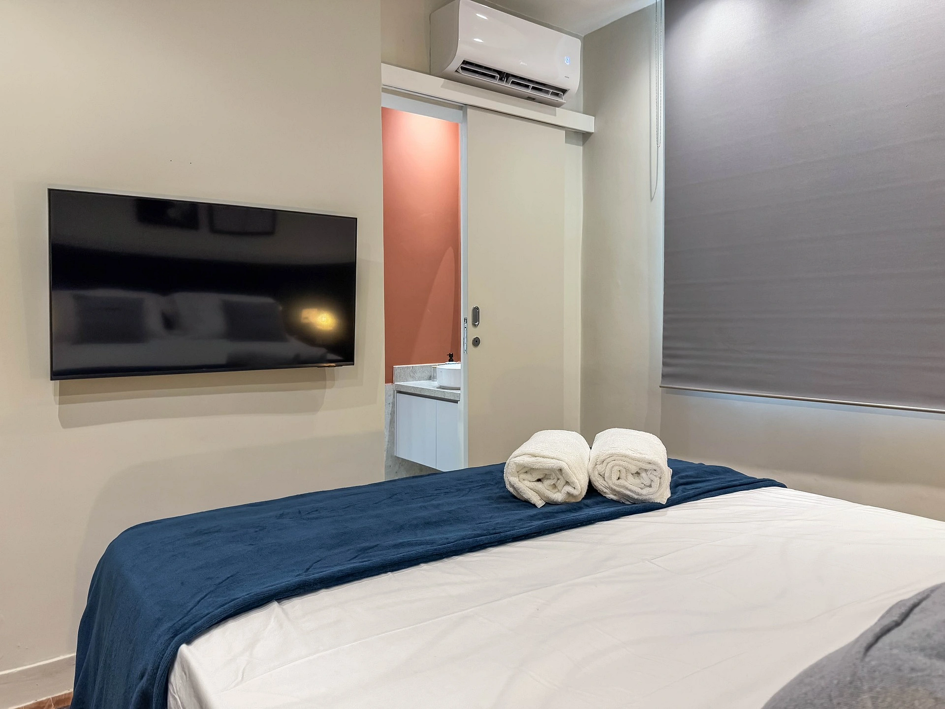 A suíte é composta com uma cama queen muito confortável, armário para guardar roupas, ar-condicionado e Smart TV, além de um estiloso e confortável banheiro privativo.