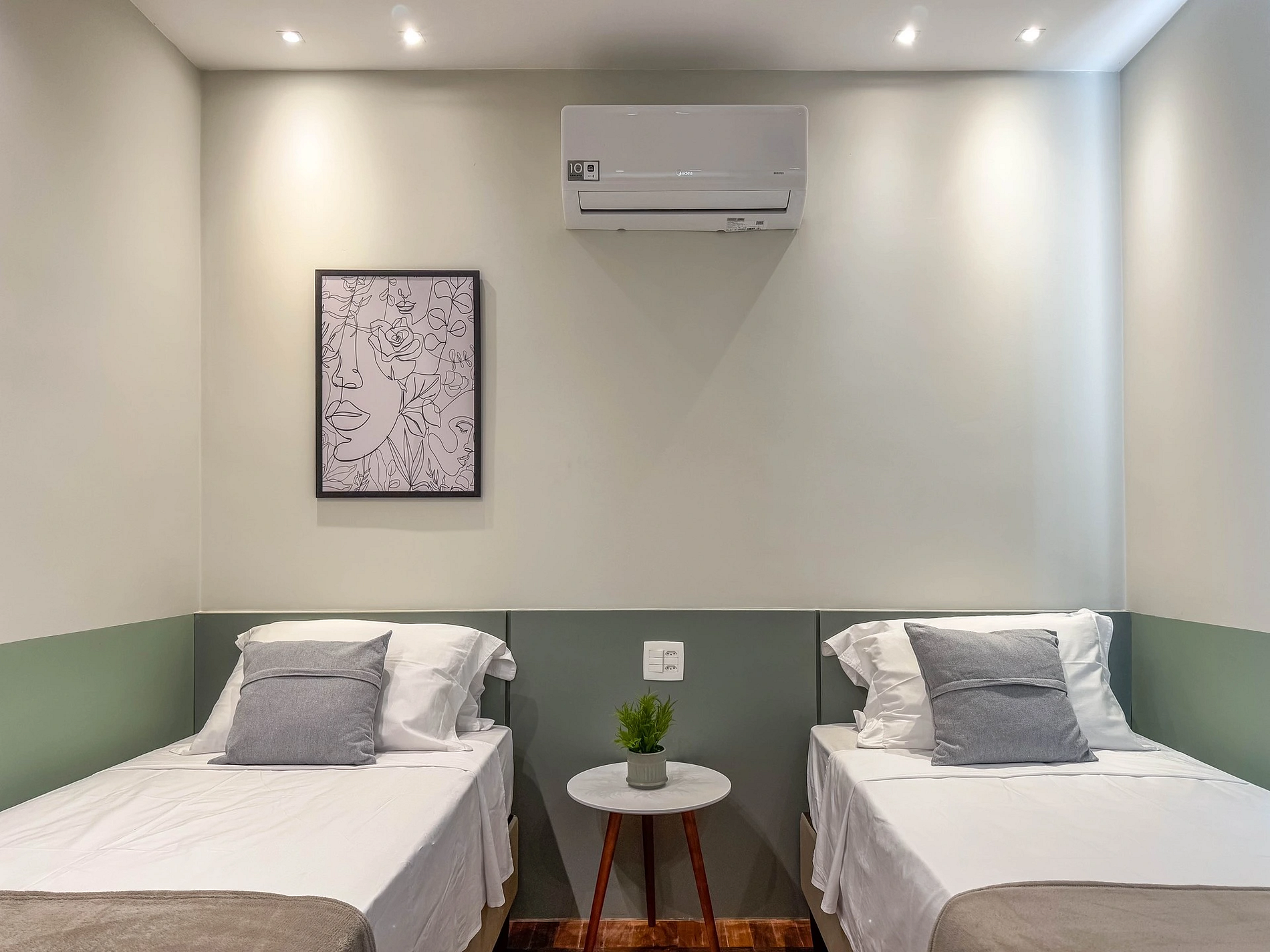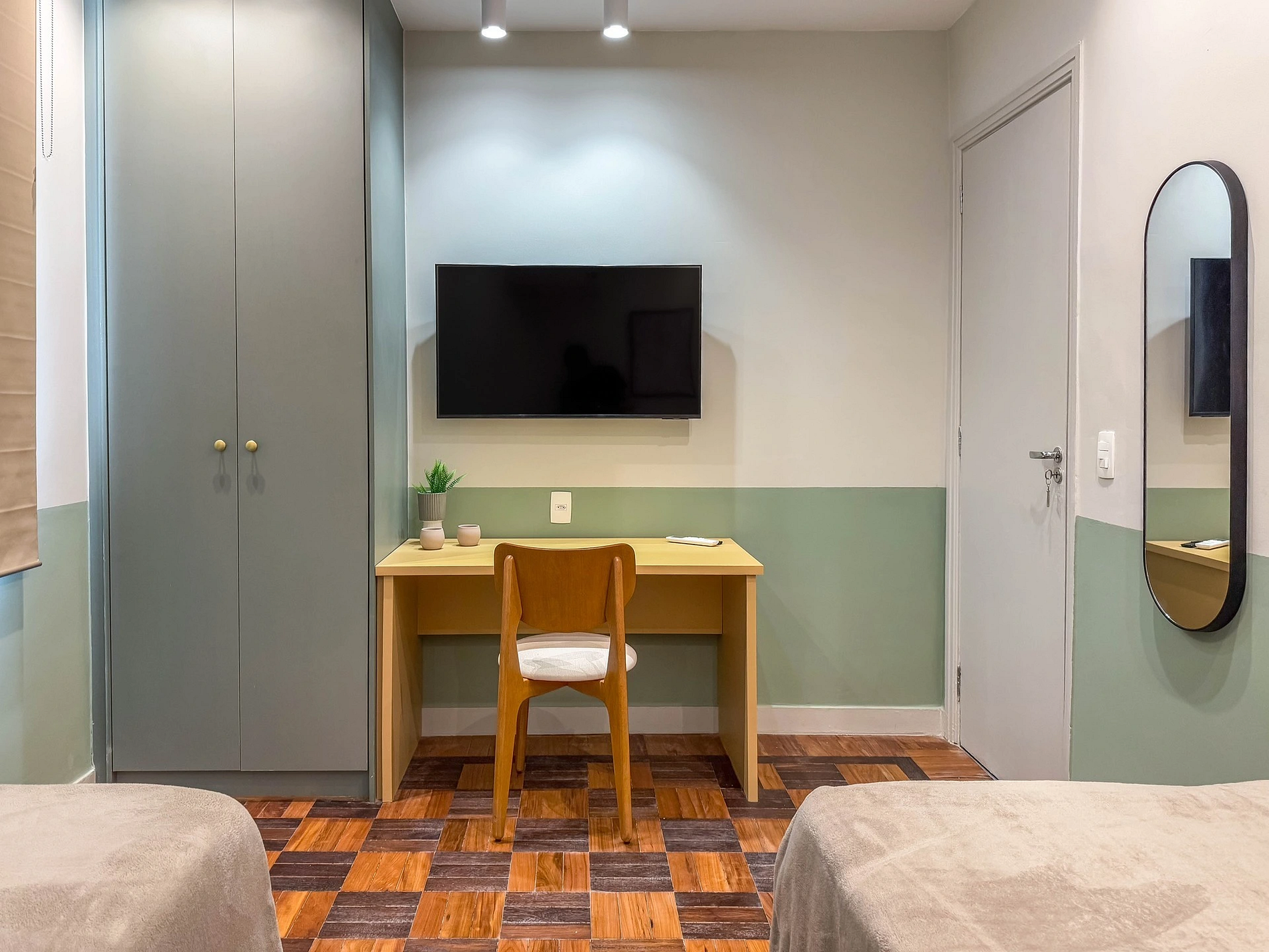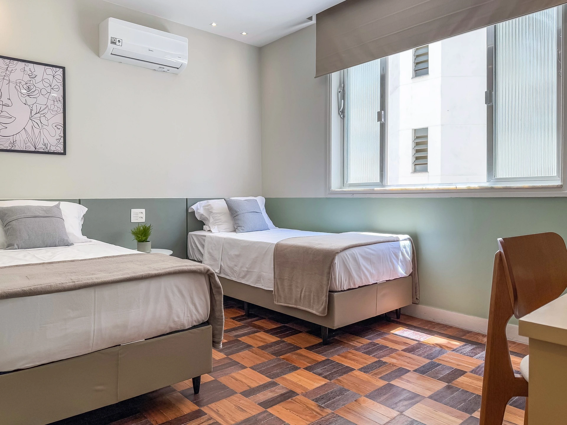 No segundo quarto, contamos com 2 camas de solteiro, ar-condicionado, armário e Smart TV e espaço para trabalho.