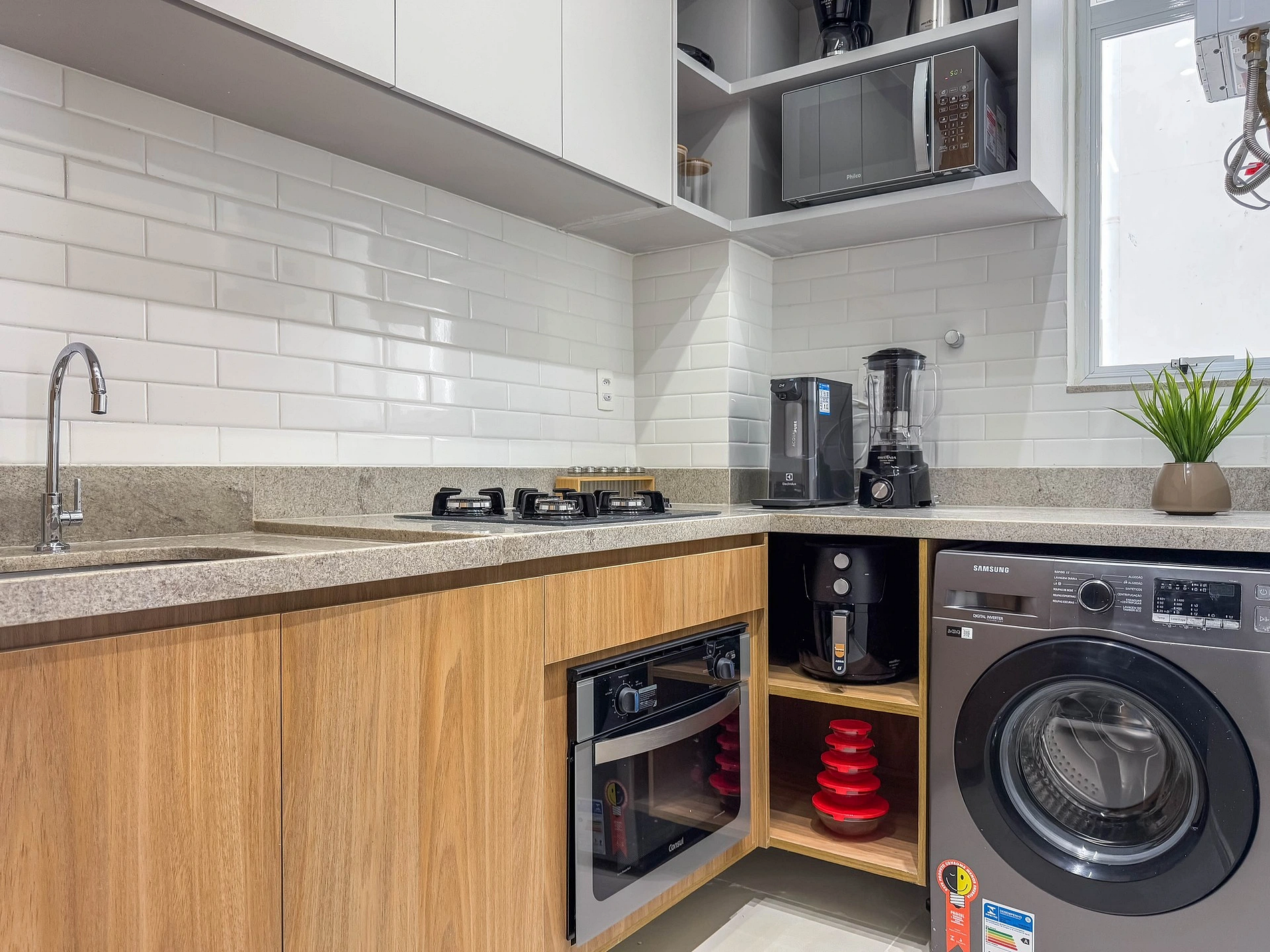 A cozinha é completa, com tudo o que uma pessoa precisa para cozinhar, Geladeira duplex, fogão, forno, micro-ondas, airfryer, liquidificador, chaleira elétrica, cafeteira, sanduicheira, purificador de água, panelas, copos, taças, talheres, utensílios de cozinha, dentre outros. Além de uma máquina de lava e seca para roupas.